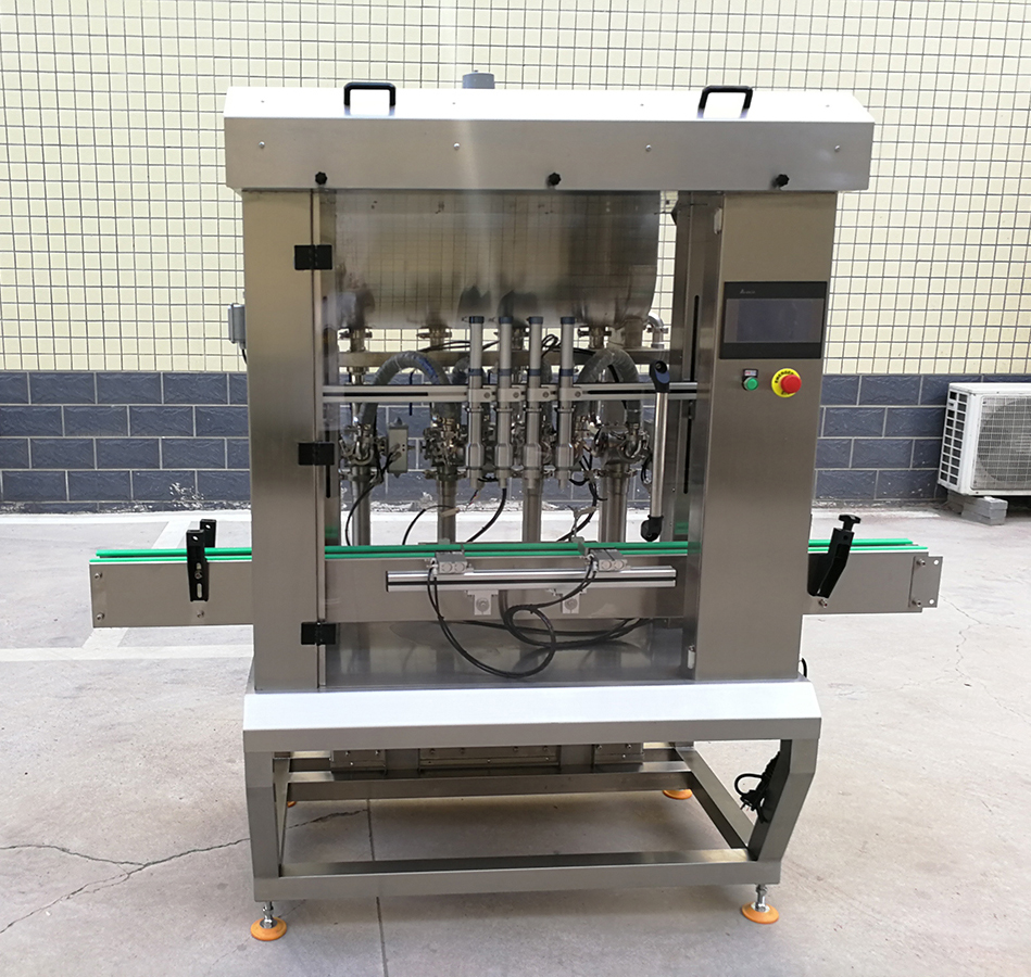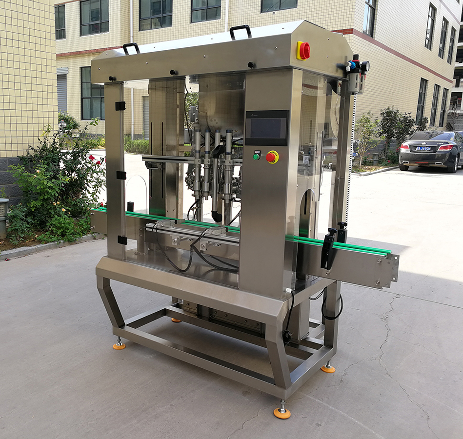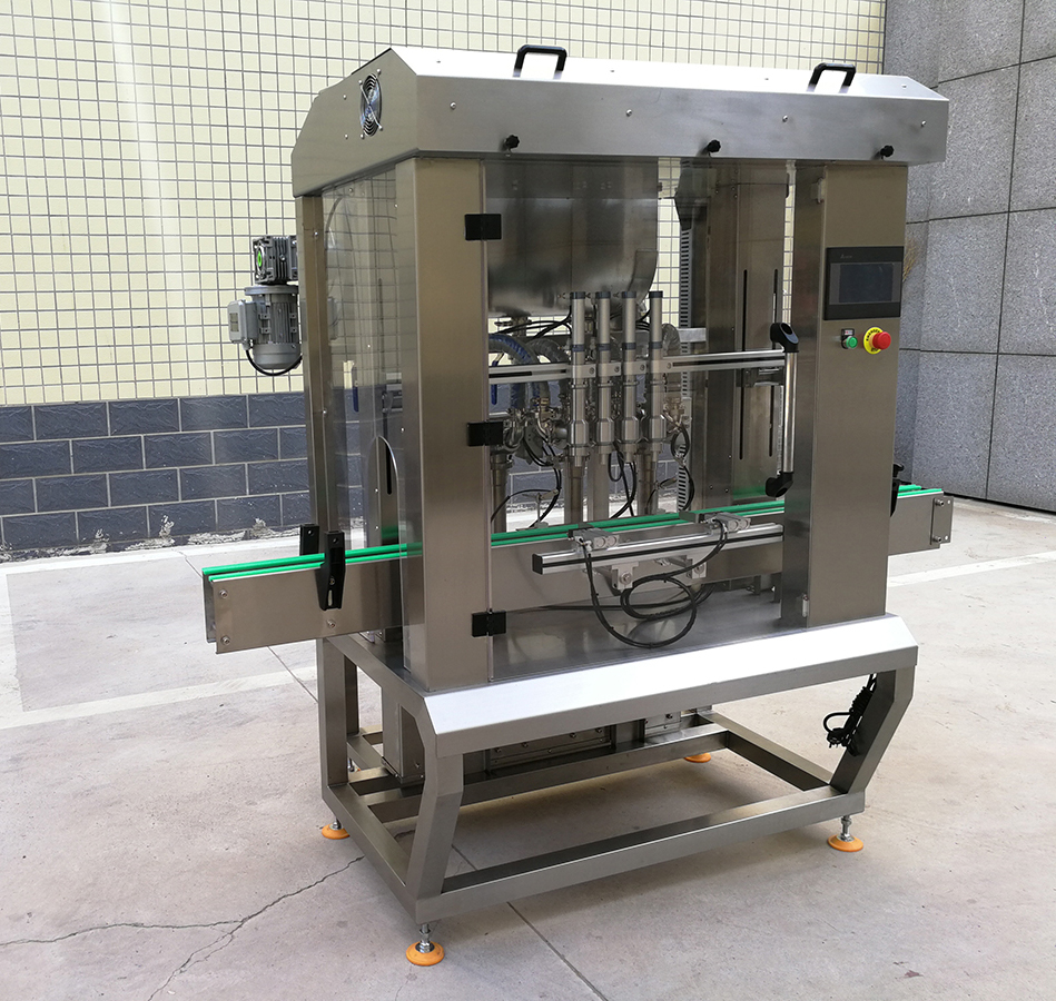 是我司新款的4頭醬料灌裝機,設計新穎、外形美觀,具有界面友好,適應性強、操作簡單、灌裝量準確,維護方便等特點。設備表面和物料按觸面均采用304不銹鋼材料制造,無滴漏,無拉絲,易清洗,完全符合食品行業標準要求。