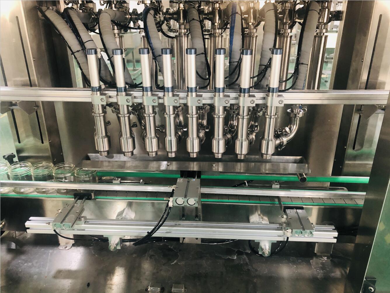 該機(jī)為8頭伺服式醬料灌裝機(jī),星火公司自主研發(fā),擁有技術(shù)及外觀專利證書,是我司針對醬料等粘稠產(chǎn)品的包裝、灌裝設(shè)計的一種新型包裝機(jī)設(shè)備,結(jié)構(gòu)合理穩(wěn)定,不易損壞,工作性能好,氣動部分均采用德國FESTO和日本SMC的氣動元件;氣缸的活塞和缸體均由聚四氟乙烯和316L不銹鋼材料制成,符合GMP要求;灌裝量和灌裝速度均可任意調(diào)節(jié),精度高;灌裝悶頭采用防滴漏、防拉絲灌裝裝置,是豆豉醬、辣椒醬、辣椒醬等顆粒醬料灌裝的很佳灌裝生產(chǎn)線。