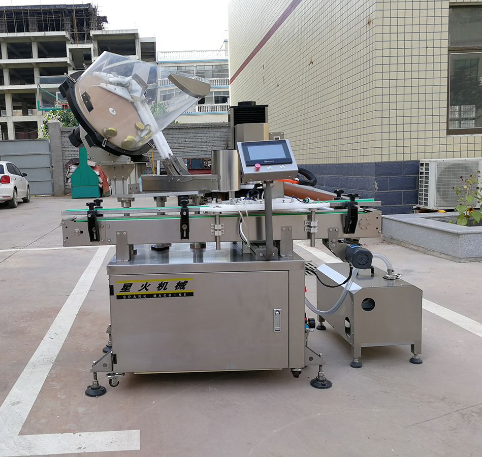 是玻璃瓶馬口鐵瓶旋緊瓶蓋的專用自動化真空旋蓋設備,該醬料玻璃瓶真空旋蓋機包括:進出罐輸送、進罐器、配蓋器、真空室、旋蓋頭等主要部件,設備采用304不銹鋼制作,外形美觀,結構考究,PLC電子光纖傳感控制,實現自動進出罐、自動配蓋、抽真空、夾緊瓶身、旋蓋等動作,多應用在醬料瓶、罐頭及保健食品行業,采用氣動和電氣編程控制取代機械傳動裝置帶來的好處是:設備可以很干凈,避免潤滑油脂對生產環境和產品的影響,很重要的是,可以對產品需達到的指標參數進行監控和靈活調整,如真空度、擰蓋力矩等。氣動裝置,運行靈活方便,大大提升了企業的工作效率。